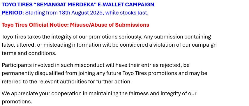 “Toyo Tires Semangat Merdeka” (“Promotion”) is organised by Toyo Tyre Sales and Marketing Malaysia Sdn Bhd (“TOYO”). By entering this Promotion, you agree to be bound by and comply with these terms and conditions, which shall form a valid and binding agreement between you and TOYO.